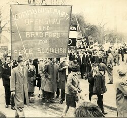 Scope and ContentBlack and white photograph of a demonstration with the Openshaw and Bradford Communist Party banner being held aloft. [Probably taken on Ardwick Green, Manchester]