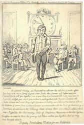 A man stands full-face, toes turned in, squinting, and looking downwards. An 'Address' is in his right hand, his left hand is in his breeches pocket; a document inscribed 'obervation' [sic] protrudes from his coat-pocket. His audience is behind him, on each side of a fireplace, for the most part asleep. A broken candle on the chimney-piece drops wax into the mouth of a sleeping man (right), to the amusement of his neighbour. Over the chimney-piece is a large clock-face, the hands indicating 10.56; above it is a carved owl and the words 'About your business'. Beneath the design: 'Gemtnen At a General Meeting, you Impowered me whenever the situation of public affairs Ran down & the main Spring of good order Broke, then Gemmen as I before said you Empowerd me to call you together; now is your Time, & a moment lost belike may never be Regaind, unless you exert yourselves to unhing [sic] that bold Monster Sedition who Stalks abroad in Broad Day Light Gemmen to destroy our Glorious Constitution & Throw the Balance of power from its place & Canker our principles with the Rust of Democracy, Gemmen its unknown the Villany thats abroad there are wheels within wheels that Regulate the Encreasing Tide of Traitorous Measures in this here big Town therefore in order to Check this growing Evil I have called you together, that we may know how and about it.'
