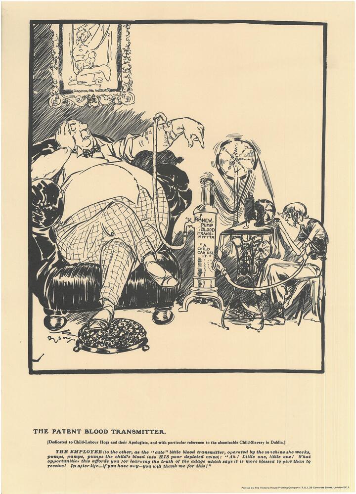 Scope and ContentImage of a fat man receiving blood from a child labourer sitting at a sewing machine. The text beneath reads: [Dedicated to Child-Labour Hogs and their Apologists, with particular reference to the abominable Child-Slavery in Dublin.] The Employer (to the other, as the "cute" little blood transmitter, operated by the machine she works, pumps, pumps, pumps the child's blood into HIS poor depleted veins): "Ah! Little one, little one! What opportunities this affords you for learning the truth of the adage which says it is more blessed to give than to receive! in after life - if you have any - you will thank me for this!"