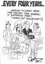 Scope and ContentCartoon headed Every four years, with an image of a man sitting in front of a television with a dog standing on his head. A nurse stands behind him. A doctor is saying to his wife Nothing to worry about Mrs Johnson. Your husband is suffering from 'World Cup rigor mortis'!