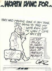 Scope and ContentCartoon headed Worth dying for, with an image of a man with a suitcase labelled West Indies walking past a newspaper hoarding reading Latest: Police to carry sub-machine guns at Heathrow Airport! He is saying: They need machine guns if dem think they going to take my white rum off me when I come back!!!