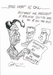 Scope and ContentCartoon headed The heat is on, with an image of Ronald Reagan and two others. Reagan is holding a paper labelled Americans held by hijackers in Beirut and a man is saying to him: Actually Mr President I believe Shi'ite has an e on the end