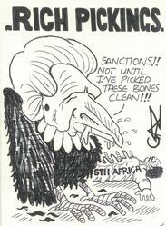 Scope and ContentCartoon headed Rich pickings, with an image of Margaret Thatcher as a vulture standing over a body labelled South Africa. She is saying: Sanctions!! Not until I've picked these bones clean!!!