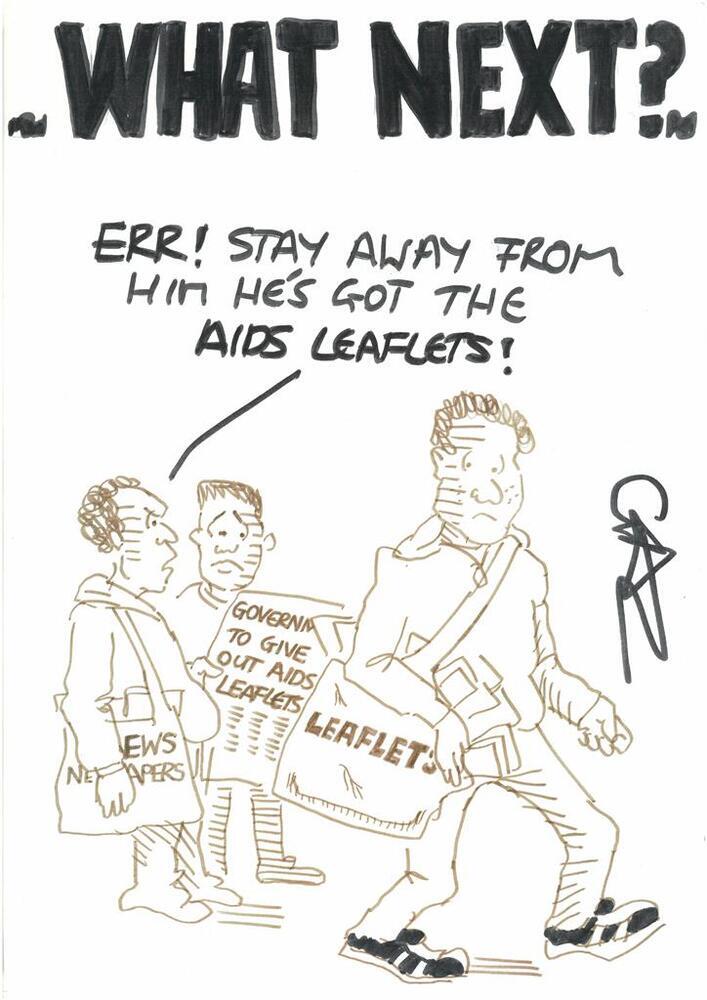Scope and ContentCartoon headed What next?, with an image of a person carrying a bag labelled Leaflets whilst two other people look on. The first has a bag labelled Newspapers and the second has a paper with the headline Government to give out AIDS leaflets. The first person is saying to the second: Err! Stay away from him. He's got the AIDS leaflets