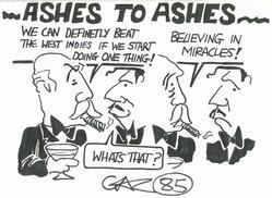 Scope and ContentCartoon headed Ashes to Ashes, with images of two men having a conversation. The first says: We can definitely beat the West Indies if we start doing one thing. The second asks: What's that? The first replies: Believing in miracles!