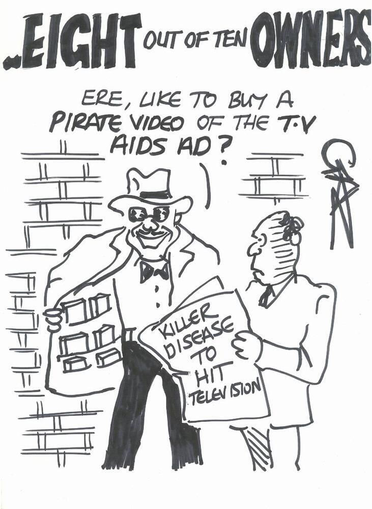 Scope and ContentCartoon headed Eight out of ten owners, with an image a man holding open his coat and saying to a second man: Ere, like to buy a pirate video of the TV AIDS ad? The second man holds a paper reading: Killer disease to hit television