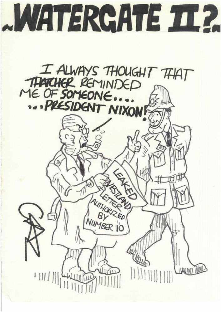Scope and ContentCartoon headed Watergate II?, with an image of a man holding a paper reading Leaked Westland letter authorized by Number 10 and saying to a police officer: I always thought that Thatcher reminded me of someone ... President Nixon