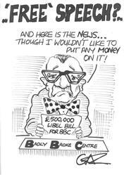 Scope and ContentCartoon headed 'Free' speech?, with an image of Robin Day holding a paper reading £500,000 libel bill for BBC. In front of him is a sign reading Badly Broke Centre and he is saying: And here is the news ... though I wouldn't like to put any money on it!