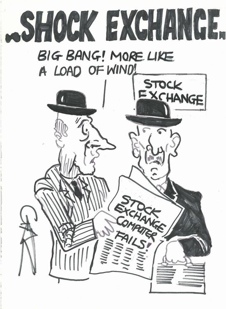 Scope and ContentCartoon headed Shock exchange, with an image of two men in bowler hats. One is reading a newspaper with the headline: Stock exchange computer fails! and is saying to the other: Big bang! More like a load of wind!