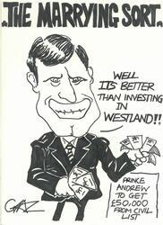 Scope and ContentCartoon headed The marrying sort, with an image of Prince Andrew holding banknotes in both hands and saying: Well its better than investing in Westland!! A billboard reads: Prince Andrew to get £50,000 from Civil List
