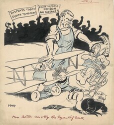 Scope and ContentCartoon by Maro showing a man with his hand on a small airplane. With his other hand is pushing away two men. One is labelled Mars PC - a present for India and the other is labelled Imperialist. In the background there is a crowd with banners reading 'Displays today, Death tomorrow' and 'Down with the Hendon Air Pageant' [Published in The Daily Worker, Tues 13 Jun 1933, page 2]