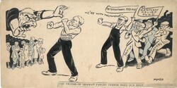 Scope and ContentCartoon by Maro showing a man labelled German Worker being confronted by a huge man with a swastika armband who hovers above a crowd of women and children. The man has his fist raised. Behind him is a group of men labelled British Workers. One is carrying a flag reading International Red Aid and shouting We're with you, comrade! Another man is carrying a flag reading German Relief Fund. The text below reads: The victims of German fascist terror need our help. [Published in The Daily Worker, Fri 16 Jun 1933, page 2]