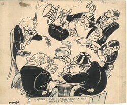 Scope and ContentCartoon by Maro showing a group of men representing various countries sitting round a table playing cards. The all have guns which they are pointing at each other. The text below reads: A quiet game of 'Banker' in the theives kitchen. [Published in The Daily Worker, Mon 26 Jun 1933, page 2]