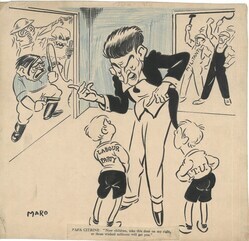 Scope and ContentCartoon by Maro showing a man talking to two children. One is labelled Labour Party and the other is labelled TU. In the background there are two doors. Through one door is a man with a whip, a skeleton with a dagger and an person in a gas mask. Through the other is a group of men one of whom is Militants and holds a hammer. Another man holds a sickle. The text below reads: Papa Citrine: 'Now children, take this door on my right, or those wicked militants will get you'. [Published in The Daily Worker, Weds 28 Jun 1933, page 2]