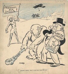 Scope and ContentCartoon by Maro showing a man holding a flag labelled Freedom for India. In the foreground are two men. One man has a big stick and the other has a large bottle labelled White Paper. Poison gas. In the background a plane is dropping a bomb. The text below reads: Churchill to Baldwin: 'Mine is a much better weapon than yours'. [Published in The Daily Worker, Fri 30 Jun 1933, page 1]