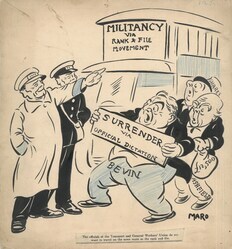 Scope and ContentCartoon by Maro showing a tram with the destination board: Militancy via Rank and File Movement. Standing in front of it are two transport workers pointing at the destination board. To their right is a group of three men. On is labelled Bevin and is holding a destination board reading Surrender via Official dictation. Another man is labelled Ashfield and is holding a bag labelled £12,500. The third man wears a hat labelled Shares. The text below reads: The officials of the Transport and General Workers' Union do not want to travel on the same route as the rank and file. [Published in The Daily Worker, Weds 12 Jul 1933, page 1]