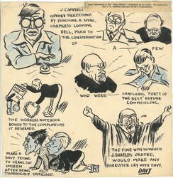 Scope and ContentCartoon by Davy showing a series of sketchs. The text accompanying them reads: J Campbell opened proceedings by punching a small, harmless looking bell, much to the consternation of a few who were snatching 'forty of the best' before commencing. The Workers Notebook bowed to the compliments it deserved. Maro and Davy trying to crawl out unseen after being thoroughly criticised. The fine way in which J Shields orated would make any barrister cry with envy. The text above reads: Some impressions of the Daily Worker conference by our artist. We undertand that JR Campbell has sent out for a knuckleduster. [Published in The Daily Worker, Tues 11 Jul 1933, page 2]