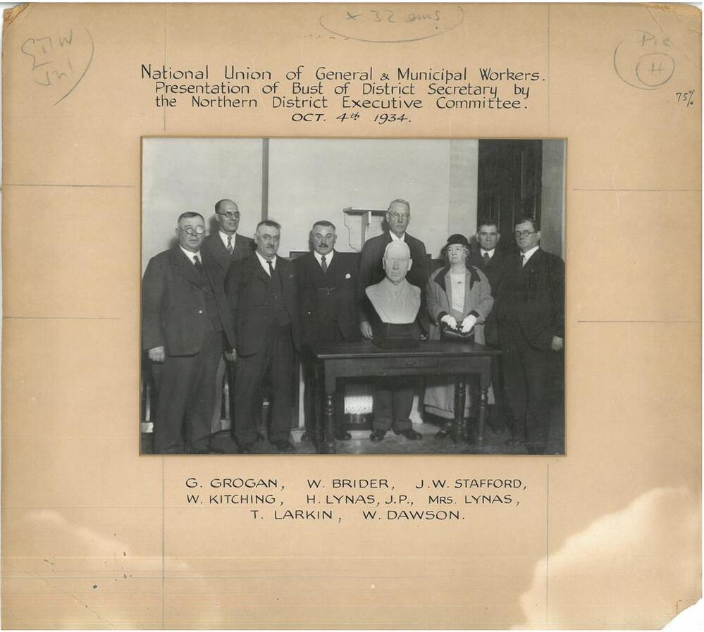 Scope and ContentBlack and white photograph of a group of seven men and one woman with a bust of the Secretary of the Northern District of the National Union of General and Municipal Workers. Headed: National Union of General and Municipal Workers. Presentation of bust of District Secretary by the Northern District Executive Committee. Oct 4th 1934. With key to sitters below