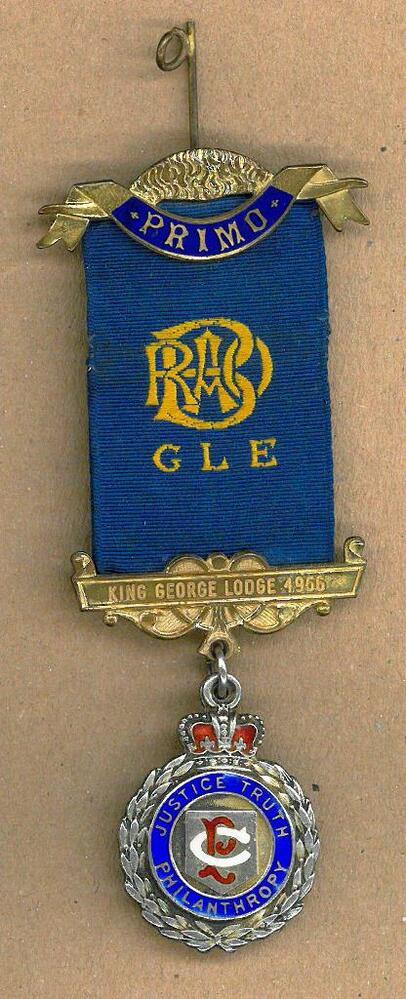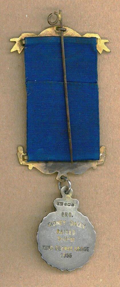 Scope and ContentKing George Lodge No 4956 Primo jewel with dark blue ribbon and circular pendant - engraved "Sidney Daley raised 5-11-51. King George Lodge 1956"
