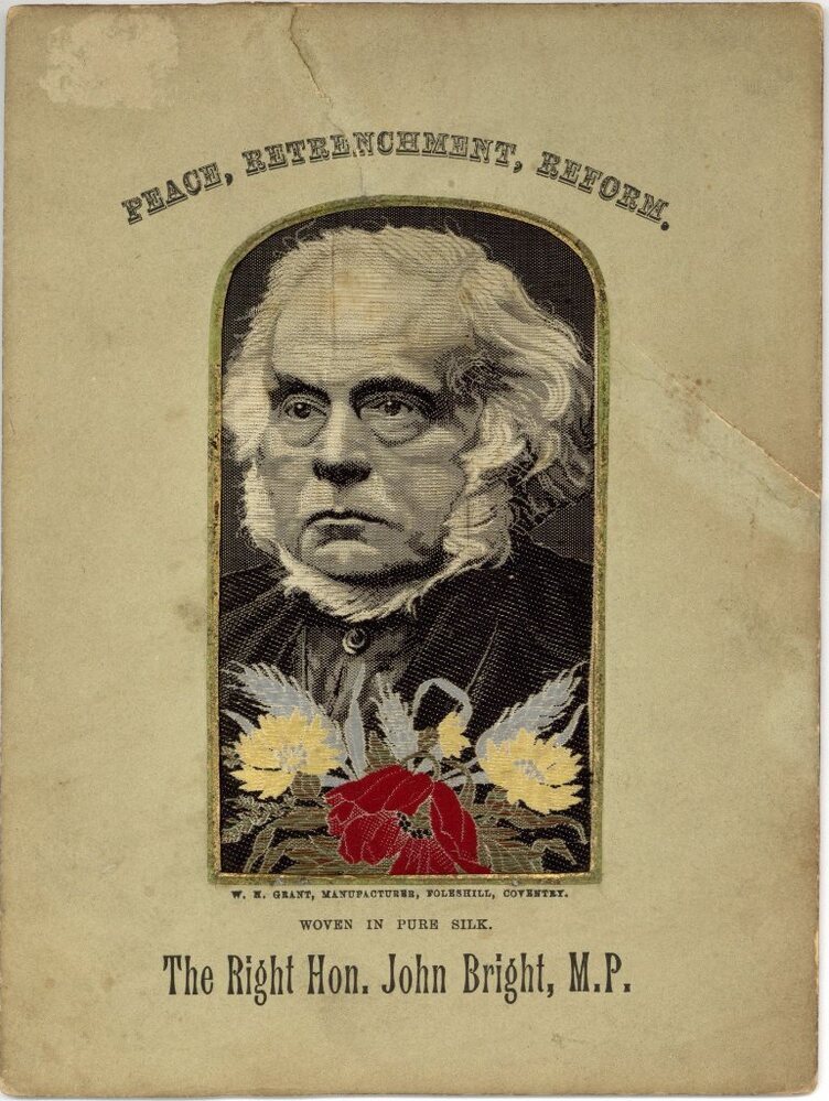 Scope and ContentWoven silk portrait of John Bright, MP. Details of other woven silk items by WH Grant on reverse