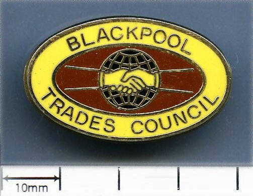 Scope and ContentEnamel badge with an image of a globe and two clasped hands and the text: Blackpool Trades Council