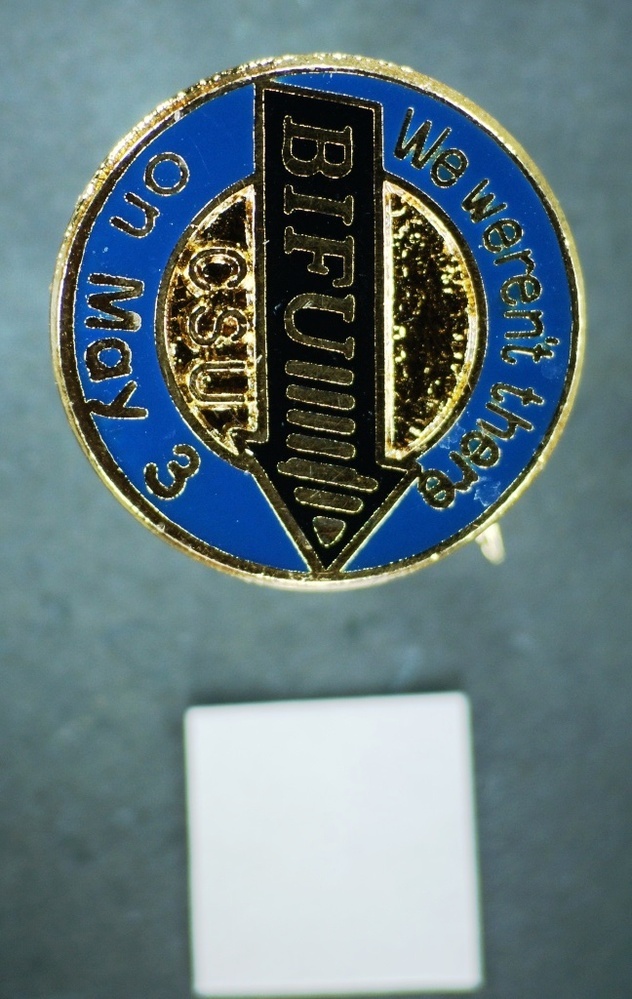 Scope and ContentEnamel badge with the text: BIFU. CSU. We weren't there on May 3