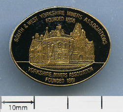 Scope and ContentEnamel badge with an image of a building and the text: South and West Yorkshire Miners Associations Founded 1858. Yorkshire Miners Association Founded 1881,