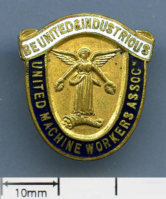 Scope and ContentEnamel badge with an image of an angel and the text: United Machine Workers Assoc. Be United and Industrious. Text on the reverse: Rg 652818