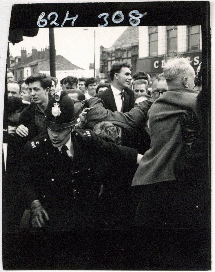 Archival historyThis image was taken during a Union Movement march to a meeting at Belle Vue, Manchester on 29 July 1962. There was a counter demonstration against Mosley and the Union Movement and scuffles broke out.