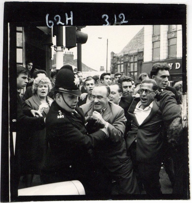 Archival historyThis image was taken during a Union Movement march to a meeting at Belle Vue, Manchester on 29 July 1962. There was a counter demonstration against Mosley and the Union Movement and scuffles broke out.