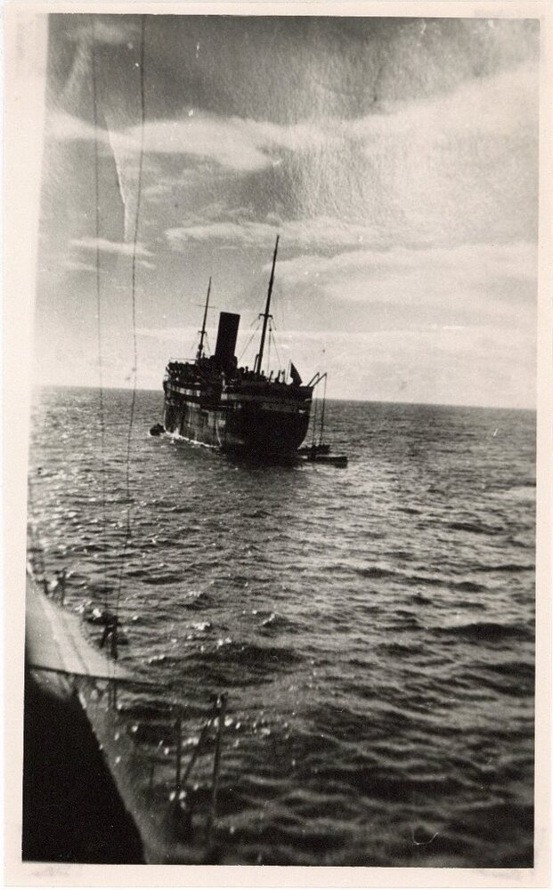 Scope and ContentCopy of a black and white photograph of the SS Christabel Calon taken from HMS Dragon. Boards can be seen being launched with crew aboard