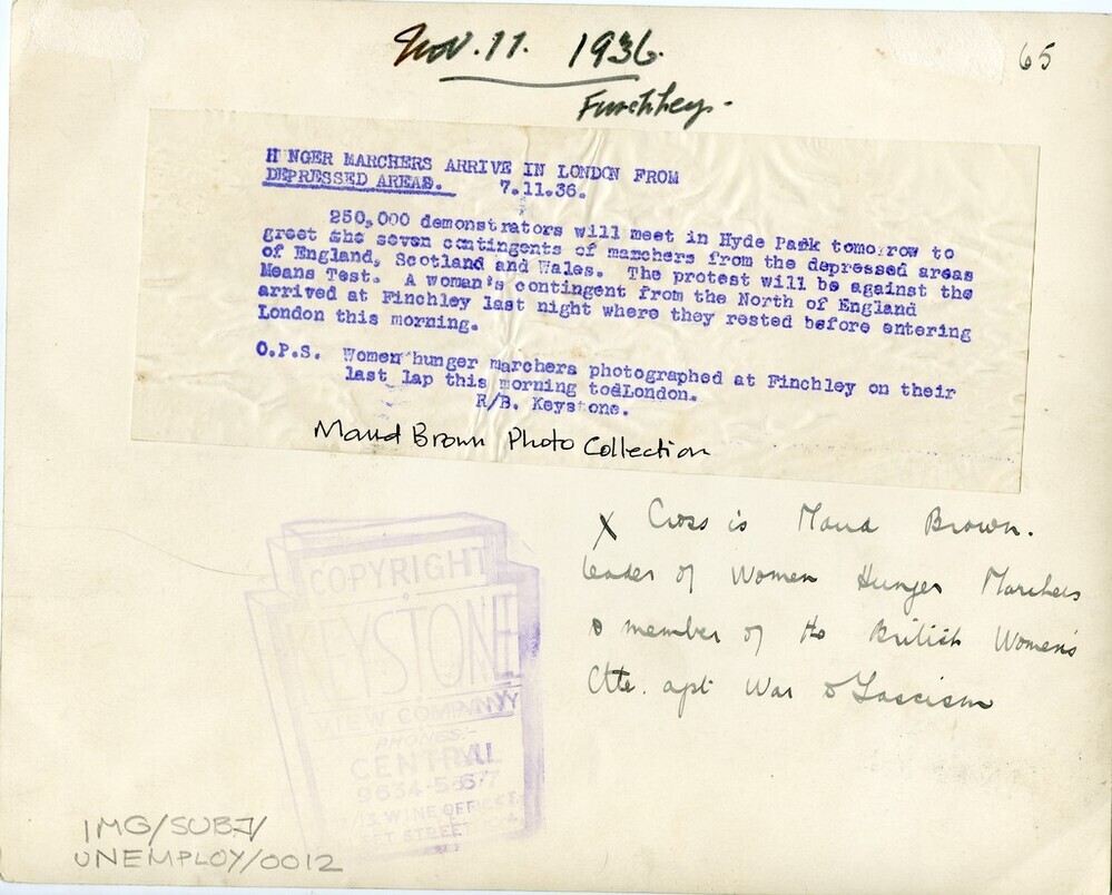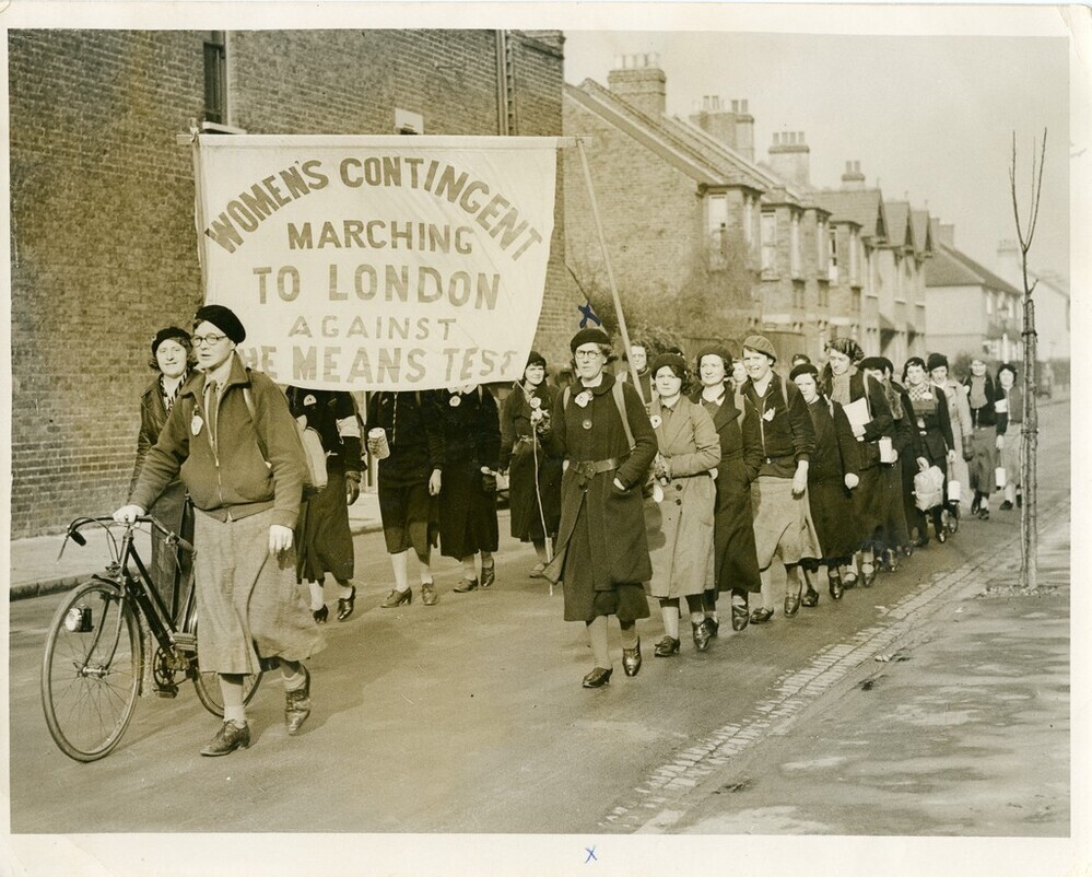 Scope and ContentBlack and white photograph of a column of women marchers from the North of England arriving in Finchley. Two women are holding a banner reading Women's contingent marching to London against the Means Test