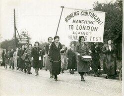 Scope and ContentBlack and white photograph of a column of women. Two women are holding a banner reading Women's contingent marching to London against the Means Test and there is a women with a drum at the head of the column. It is captioned: Country women marchers on way to London, near St Albans