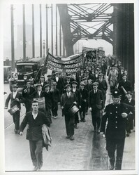Scope and ContentCopy of a black and white photograph showing a column of men marching across a bridge. In the foreground is a banner reading: National Unemployed Workers' Movement Stockton branch
