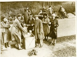 Scope and ContentBlack and white photograph captioned: Women hunger marchers take a meal. A group of women on either side of a road are preparing and eating a meal