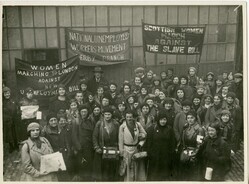 Scope and ContentBlack and white photograph of a large group of women. Behind them are banners - Women marching to London against the new Unemployment Bill; National Unemployed Workers Movement, Derby Branch; Scottish women march against the slave bill