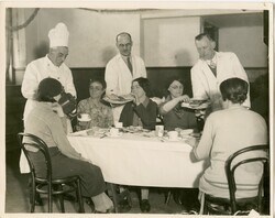 Scope and ContentBlack and white photograph of 5 women marchers having breakfast at Co-op. They are being served by three men