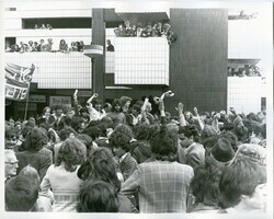Scope and ContentBlack and white photograph of a National Party march in Blackburn, Lancashire showing marchers, opposition and onlookers. Most of the demonstrators are obscured by onlookers and other people with raised clenched fists