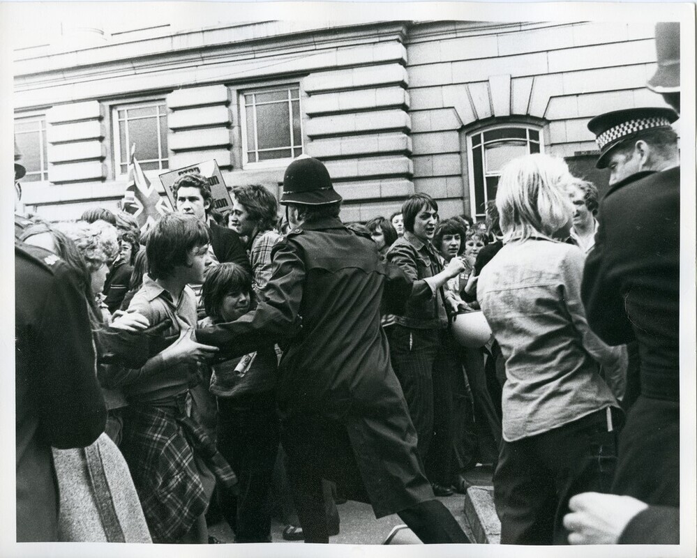 Scope and ContentBlack and white photograph of a National Partymarch in Blackburn, Lancashire showing a police officer holding back a group of demonstrators