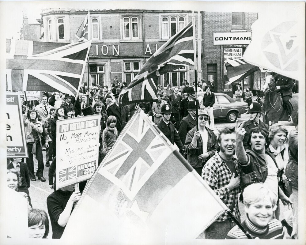Scope and ContentBlack and white photograph of a National Party march in Blackburn, Lancashire showing a group marching down the street holding placards and union flags. There are onlookers in the background