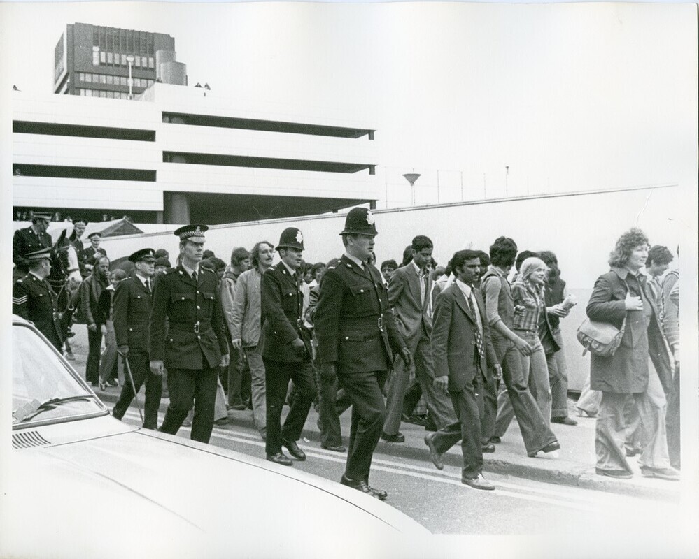 Scope and ContentBlack and white photograph of a National Party march in Blackburn, Lancashire showing police officers walking alongside a group of people on the pavement. They are being followed by mounted police officers