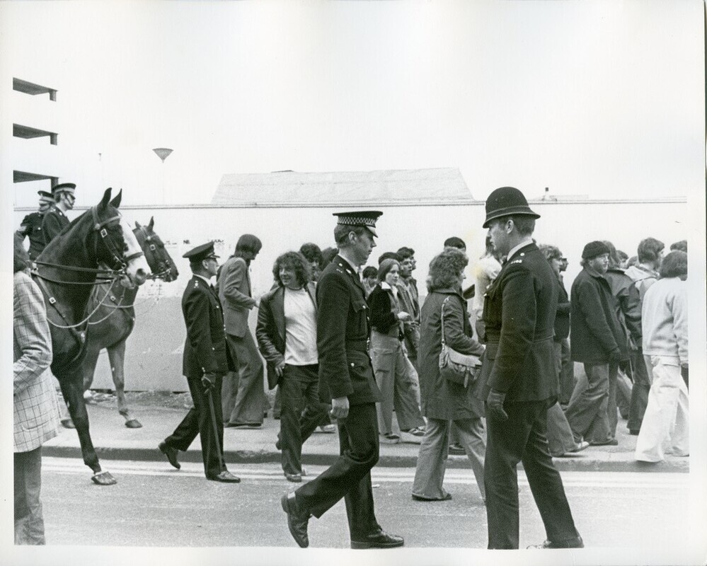 Scope and ContentBlack and white photograph of a National Party march in Blackburn, Lancashire showing police officers walking alongside a group of people on the pavement. They are being followed by mounted police officers