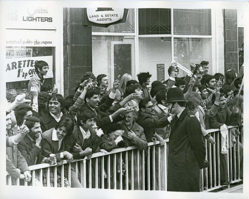 Scope and ContentBlack and white photograph of a National Party march in Blackburn, Lancashire showing a group of people leaning over a barrier gesticulating. They are being watched by a police officer