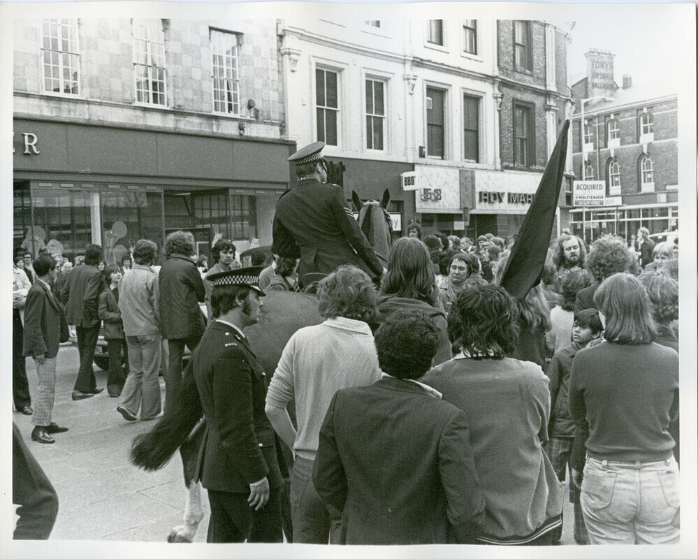 Scope and ContentBlack and white photograph of a National Party march in Blackburn, Lancashire showing a mounted police officer and a large group of people