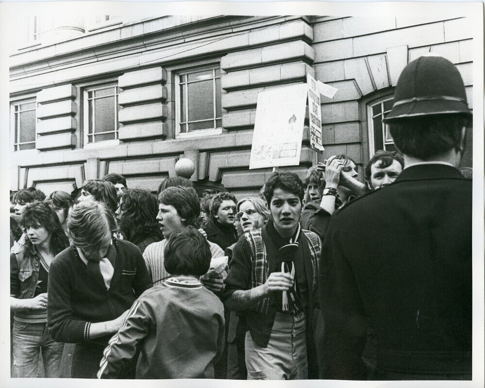 Scope and ContentBlack and white photograph of a National Party march in Blackburn, Lancashire showing a police officer with his back to the camera and a large group of people