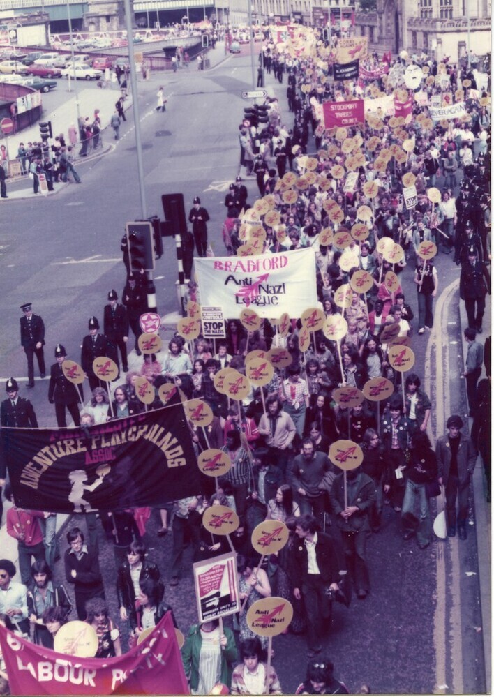 Scope and ContentColour photograph of the march to Alexandra Park showing the column of marchers near Manchester Cathedral. There are various banners including Bradford Anti Nazi League, Adventure Playgrounds Association and Stockport Trades Council