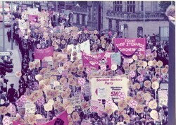 Scope and ContentColour photograph of the march to Alexandra Park showing the column of marchers near Manchester Cathedral. There are various banners including the Socialist Workers Party and Gardner and Sons Joint Shop Stewards