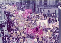Scope and ContentColour photograph of the march to Alexandra Park showing the column of marchers near Manchester Cathedral. There are various banners including the Socialist Workers Party and Gardner and Sons Joint Shop Stewards