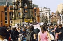 Scope and ContentColour photograph of demonstrators in Albert Square, Manchester. There are various banners including the National Coalition of Anti Deportation Campaigns