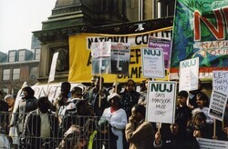 Scope and ContentColour photograph of demonstrators in Albert Square, Manchester. There are various banners and placards including the National Coalition of Anti Deportation Campaigns, Respect and the National Union of Journalists
